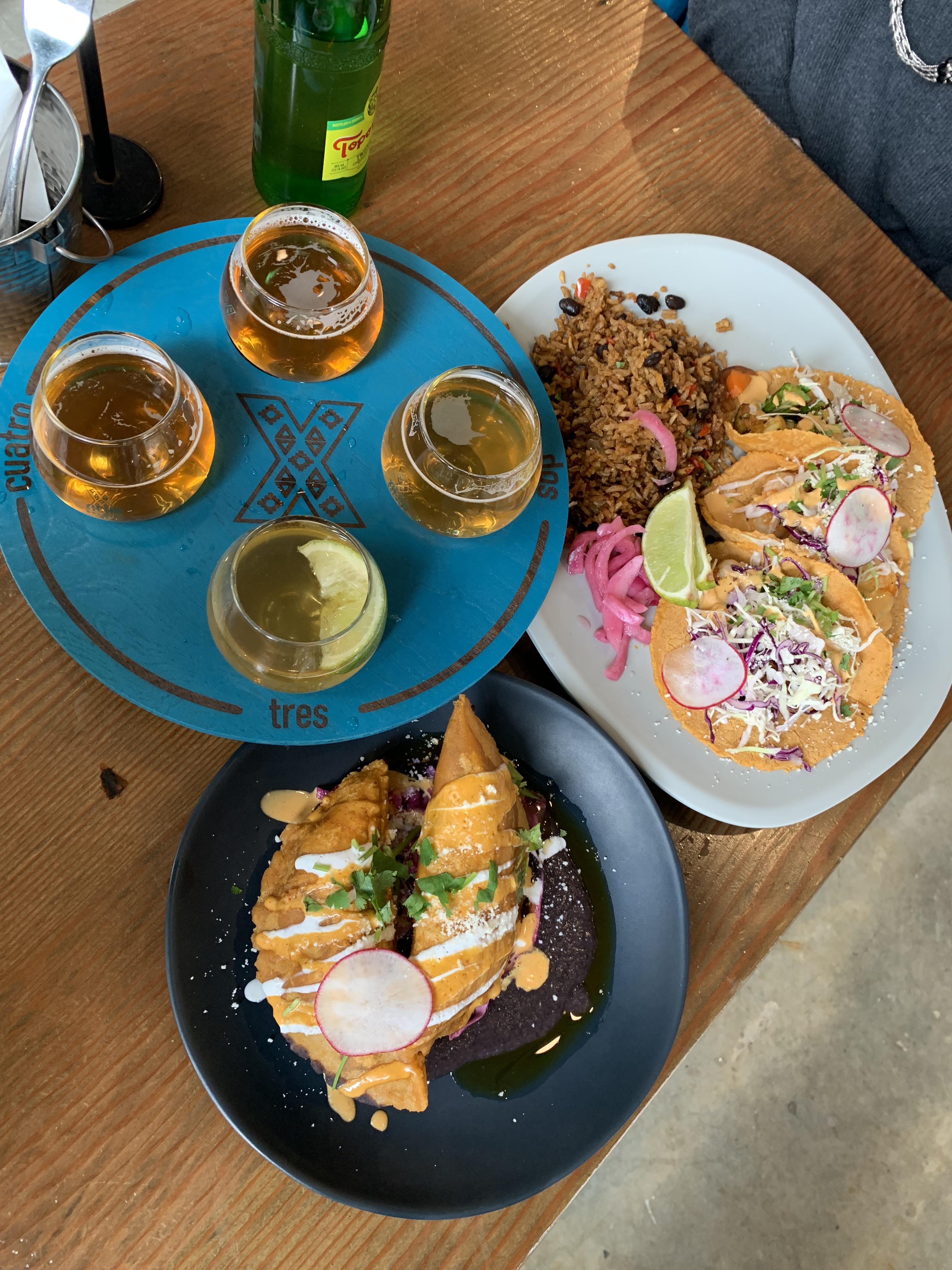 The cerveza menu is also tilted south in its own way. Mexican, Vienna, and dark lagers, along with a pair of guava-infused beers provide a decent roundness to the palette; there is, of course, an IPA and even a sour fruit beer. Chela, the Mexican-style lager, comes with a lime wedge that makes all the difference. The Gran Guayaba is aged in Tequila barrels, is 8.3%, and has a strong floral-woody component and crushable blonde ale body. There are also several margarita options (available in a flight, too!). Xicha Morada is a traditional Peruvian soft drink made from purple corn, and is offered as a non-alcoholic option (though it was sold out when I went).