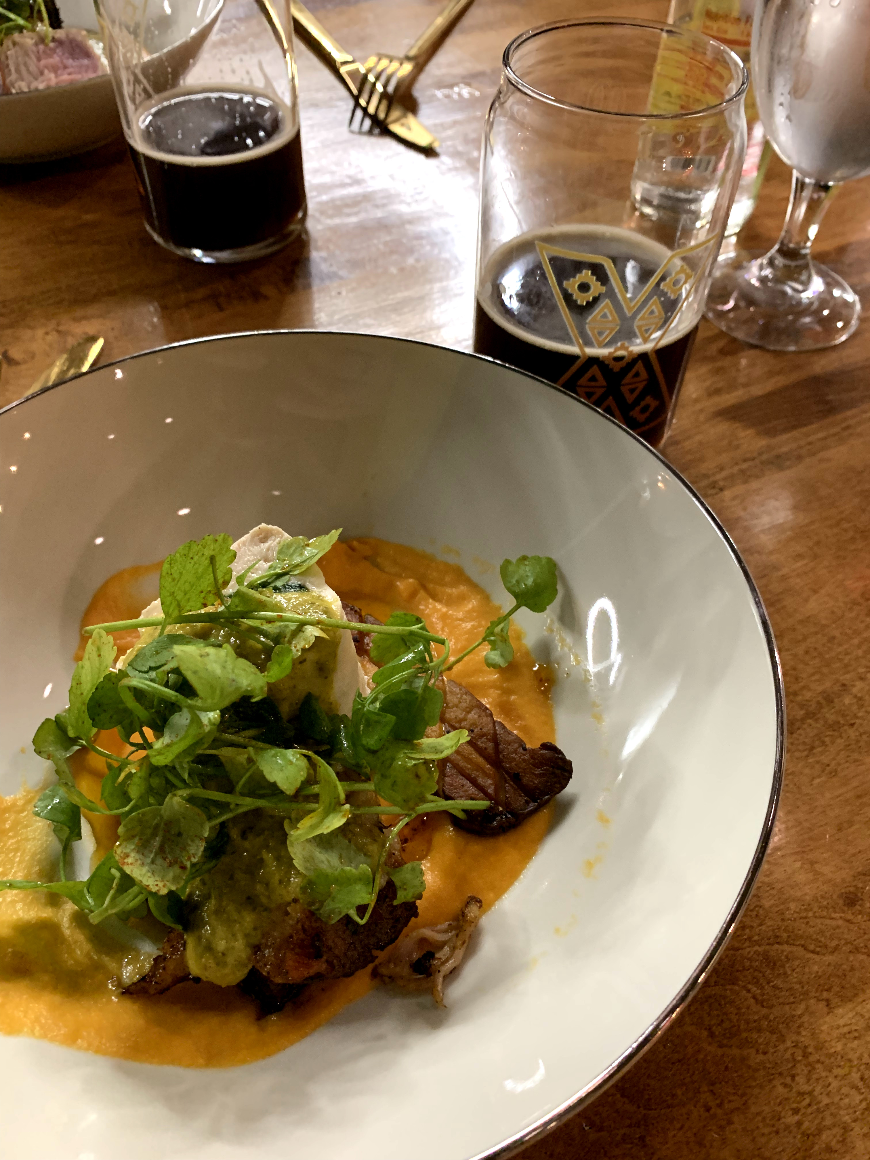 Without much further ado, and through the attentive courtesy of the wait staff, the main course, Pachamanca, appeared, a glistening turf-and-turf of melting pork belly lardon and a chicken roulade, stood on end to resemble osso bucco and stuffed with huacatay (black mint) herb sauce. All wading in a bath of smoothly pureed sweet potato. To pair, my favorite beer of the night: Cabrito Bock, which was brewed for this occasion and spent five months lagering.