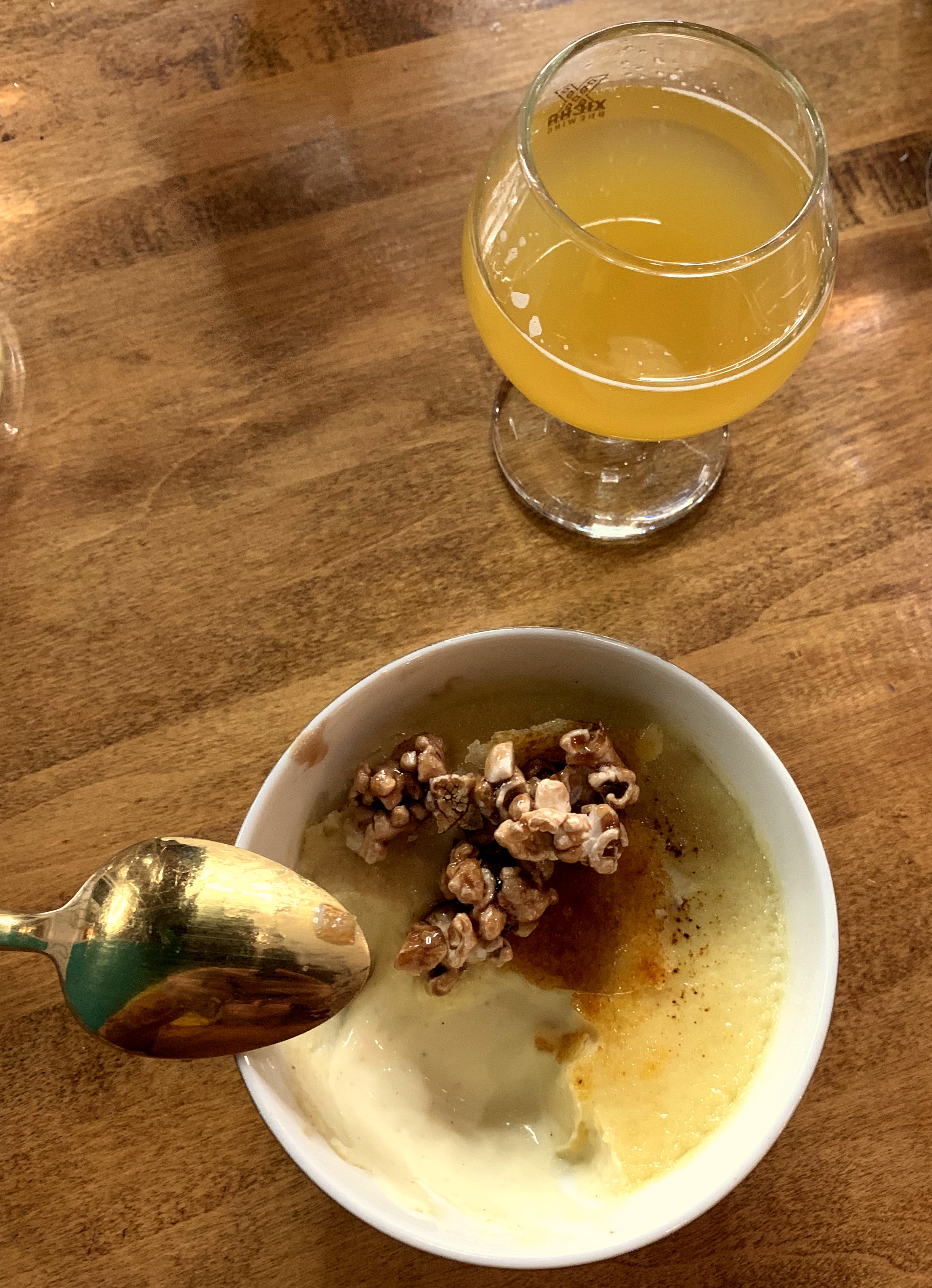 I’ve written before about the importance of acid in beer pairing. Whether coming from the beer, food, or both (most often the case), orchestrating acidic elements is tricky. This was a particularly bright, pingy dish. The popcorn-wheat beer duet honked out the trombone section. Citric passionfruit syrup and lemon blew Bossa flute, and the airy sugar-egg-cream of the custard beat timbale, conga, and cuíca.